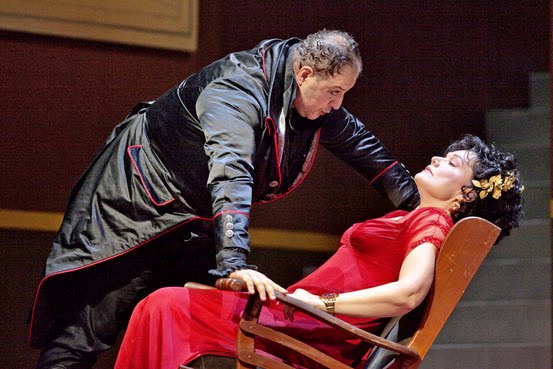 Lasciamo perdere le bruttissime non-scenografie di Richard Peduzzi, riciclatore di se stesso all’infinito che propone, ormai imbiancati di colore diverso, ma sono sempre quelli, i medesimi muri di mattoni alti e incombenti di varie fogge e di vari tagli, accessoriati con scale, scalini, rampe e torrette, che ci perseguitano dal “Lucio Silla”, passando poi per “Tristan und Isolde”, “Così fan tutte” e “Carmen” e che creano non-luoghi potenzialmente adatti a qualunque opera (dal “Pirata” a “Elektra”, da “Otello” a “Gli Ugonotti”, etc.); lasciamo perdere gli inappropriati e comici costumi di Milena Canonero che addobba Scarpia come un rettile (che ardita metafora, eh!) e la povera Tosca come una “damazza” dal gusto pacchiano (le fasce per capelli e le calze rosse velate al secondo atto abbinate all’abito: particolari di gran classe!); lasciamo perdere la regia dalla comicità involontaria di Luc Bondy che sfrutta particolari e controscene inutili facendoli passare per approfondite analisi sui personaggi, trasformandoli invece in maschere grottesche.