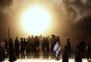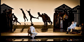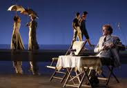 Gustav von Aschenbach, figura fortemente autobiografica di Thomas Mann, è un intellettuale che ha già vissuto. Ha attraversato e affrontato tutte le fasi della vita con routine, con ferrea autodisciplina, con austerità, imponendoselo, riuscendoci, coltivando la purezza della sua scrittura e inseguendo un ideale di bellezza, anche morale, che crede di aver raggiunto; ma forse proprio per questo si ritrova solo a meditare sulla vacuità di tale condizione e sulla giustezza di tanta rettitudine.In fondo Gustav von Aschenbach è un personaggio passivo; vuole vivere, o tornare a vivere, e lo fa spiando gli altri, osservandoli, studiandoli, giudicandoli, è un voyeur della vita che non partecipa, la insegue, ma non né coglie l’essenza, non si lascia travolgere. Non agisce mai Gustav von Aschenbach, nemmeno quando si scopre affezionato, infatuato, innamorato, ossessionato del bellissimo Tadzio, giovinetto che incarna la bellezza a lungo vagheggiata, quella beatitudine arcaica, quella perfezione di forme sensuali eredità classica dell’apollineo; lo insegue, certo, ma non riesce a parlargli, vorrebbe salvarlo dal colera, ma si blocca di fronte alla possibilità di avvertire la madre del contagio, vagheggiando un mondo mostruoso senza uomini, abitato solo da lui e dal bel ragazzino polacco. Dall’apollineo si passa al dionisiaco: non più “oggetto osservato”, ma “oggetto desiderato”, lussurioso, da possedere, e intanto tutto intorno a lui cambia, ruota, si muove agisce: Venezia brulica di personaggi grotteschi guidati dalla mano melliflua delle incarnazioni dionisiache; Venezia cambia continuamente sotto l’influsso del dio, con piccoli tocchi, con pochi oggetti evocati, con le sue luci seducenti e vaporose ed il suo mare solo suggerito; Venezia si ammala, diventa putrescente, esacerbata nei colori e venefica nei miasmi lagunari; Venezia diventa una tomba di luce fioca e ombre, testimone dell’unico gesto vivo che il morente Aschenbach compirà per salvare il “suo” Tadzio, il suo ideale, dalla contaminazione violenta dell’ “altro”. Questa, in sintesi lo splendido ed essenziale allestimento, nato in coproduzione con la English National Opera di Londra e con il Théâtre Royal de la Monnaie di Bruxelles, curato dalla regia di Deborah Warner coadiuvata dalle scabre scenografie di Tom Pye, dai costumi primi del ‘900 (come faceva notare l’amica Carlotta Marchisio, più vicini a Fitzgerald che a Mann) di Chloe Obolensky, dalle piacevoli coreografie di Kim Brandstrup e le luci di Jean Kalman. E intanto ci si domanda: perché per mettere in scena le opere di repertorio si sperperano allegramente montagne di soldi producendo (con la pretesa di farle ingoiare al pubblico facendole passare per Kultura, senza colpo ferire) le idee sbilenche di un Cassiers, o un Bondy, o un Mussbach, quando invece ci sono in giro registi capaci e di ben altro spessore drammaturgico che impongono un’idea senza massacrare l’opera, al contrario, esaltandone il contenuto?