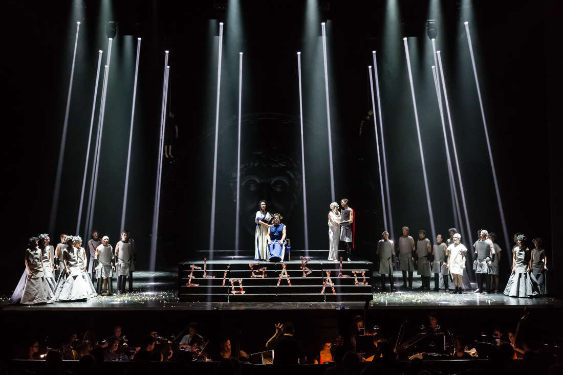 La regia di Thomas Jolly, giovane regista di prosa che pare si stia facendo un nome, era tutta giocata su un soppalco mobile, cioè Roma e le sue istituzioni, e un sistema di fari sul palco, cioè il sole, nume cui Eliogabalo è associato, che si illuminavano con intensità variabile a seconda della situazione creando contrasti cromatici con uno sfondo quasi sempre nero. Lo spettacolo, pur non essendo stato particolarmente fantasioso, è risultato godibile e ha sempre reso comprensibile quanto accade nel libretto, seppure l’azione sia spostata in un’epoca senza tempo (con reminiscenze di film di fantascienza, ma anche orientali a tratti). Alcuni momenti, quali il volo dei gufi infausti (ballerini in questo caso) e l’ultimo atto sono stati particolarmente azzeccati; spettacolare visivamente parlando e di grande effetto l’immersione di Eliogabalo in una piscina di acqua dorata da cui usciva completamente rivestito d’oro. La recitazione dei cantanti è stata ben curata pur restando convenzionale, le comparse (ballerini e ballerine seminudi) hanno svolto adeguatamente il loro ruolo puramente estetico. I costumi dai tratti al contempo antichi e futuristici di Gareth Pugh (stilista di grandi star del pop come Lady Gaga, Rihanna e, specialmente, Beyoncé) sono stati evocativi e si inserivano armoniosamente nel contesto.